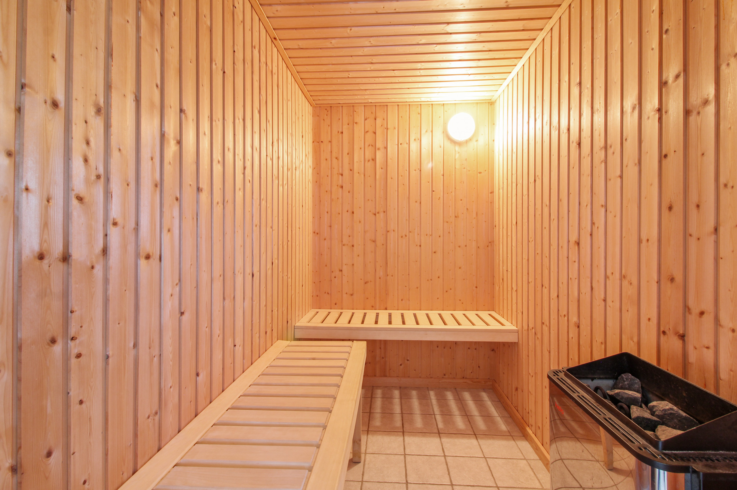 Der er 2 badeværelser med bruseniche og 2 toiletter. Der er gulvvarme på 2 badeværelser. I saunaen er der mulighed for afslapning.