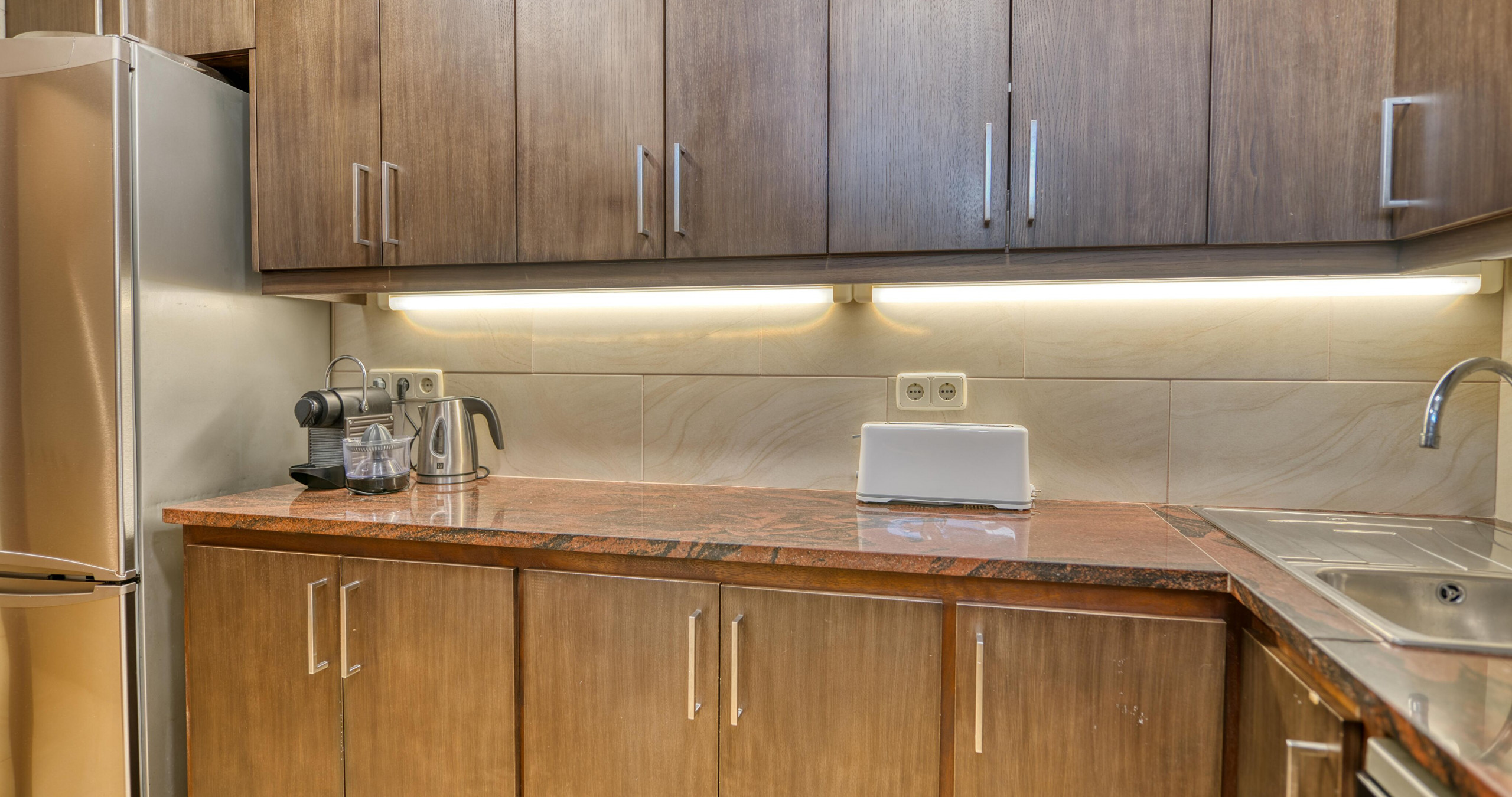 La cuisine indépendante, à gaz, est équipée avec réfrigérateur, micro-ondes, four, lave-vaisselle et cafetière.