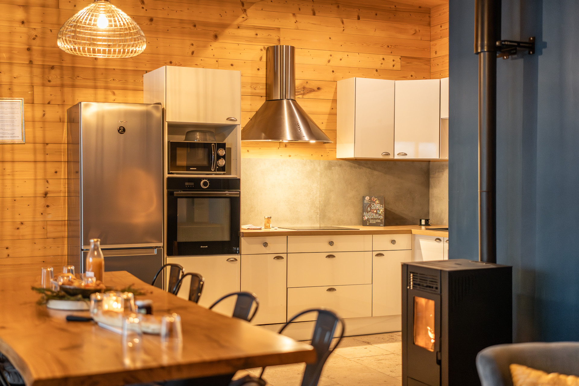 セラミック電気コンロのオープンキッチンには、冷蔵庫、電子レンジ、オーブン、冷凍庫、食器洗い機、キッチン用品、コーヒーマシーン、トースター、やかん、ジューサーが備わっています。