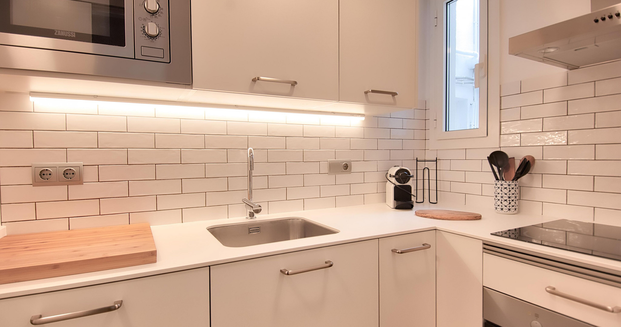 電気コンロの独立キッチンには、冷蔵庫、オーブン、皿/フォーク・ナイフ、キッチン用品、コーヒーマシーン、トースターが備わっています。