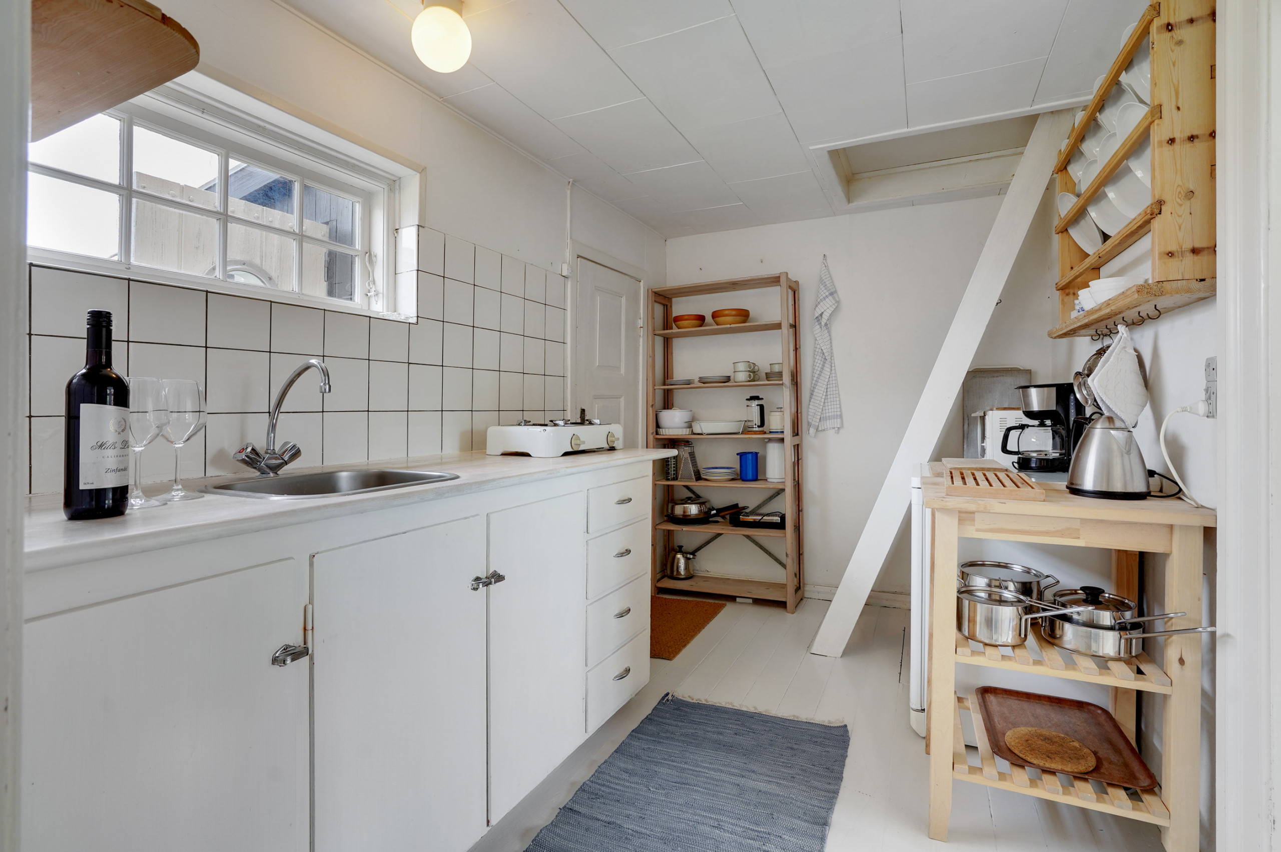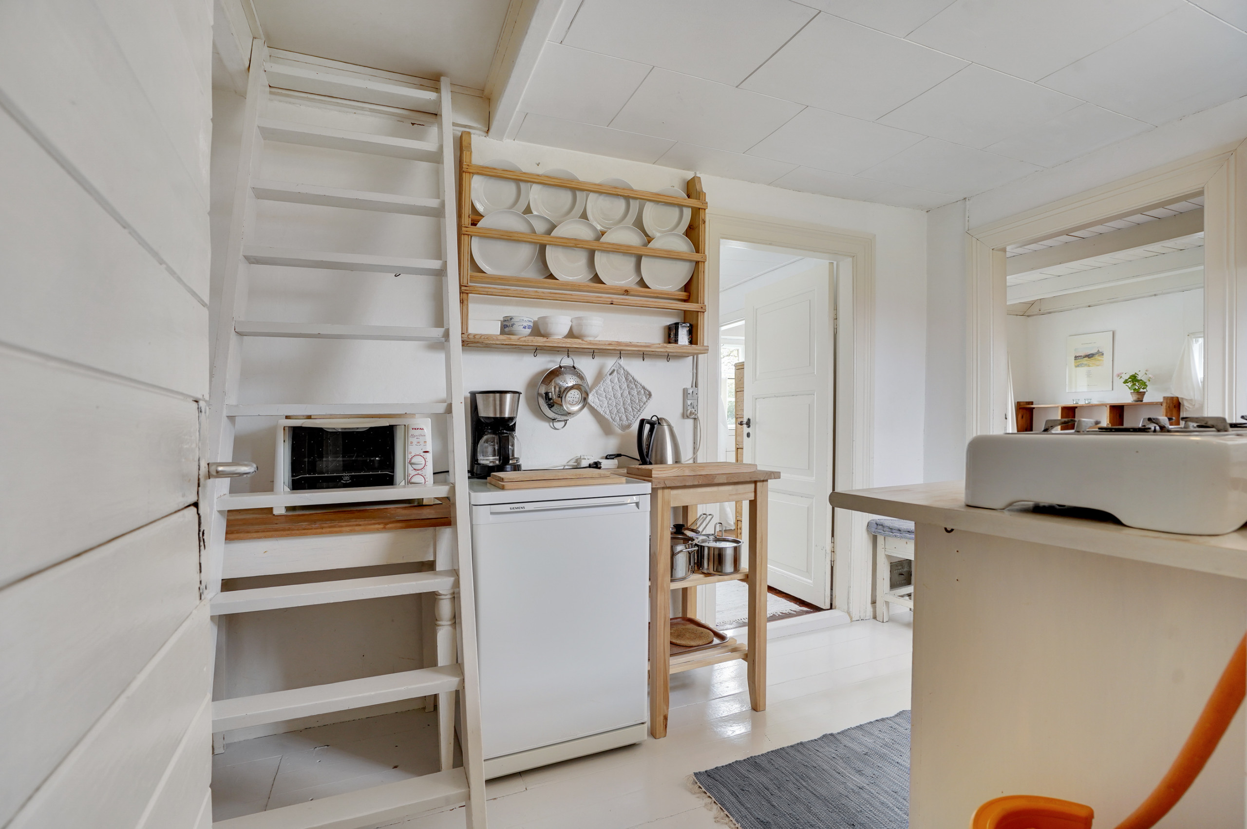 ブタンガスの独立キッチンには、冷蔵庫、オーブン、冷凍庫が備わっています。