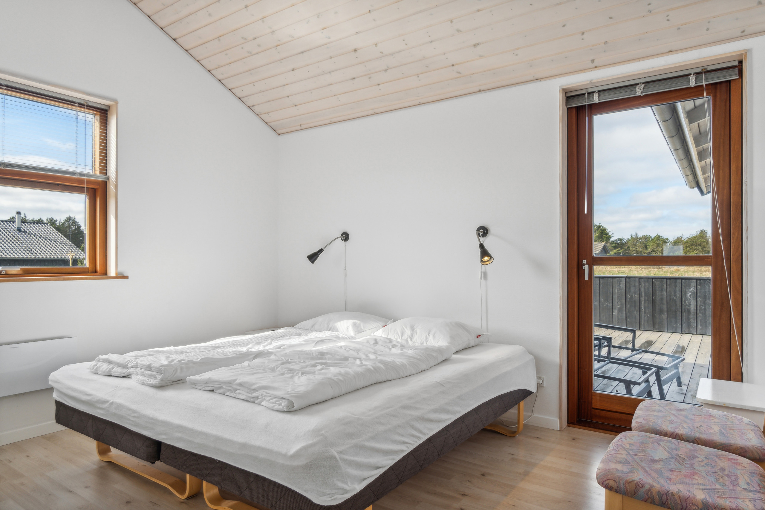 Det er i alt 3 soverom. Soveplassene fordeler seg på: 4 soveplasser i dobbeltsenger. 2 soveplasser i enkeltsenger. 2 soveplasser på madrasser. 2 av disse soveplasser finnes på hemsen i huset. I tillegg er det 1 stk. barneseng.