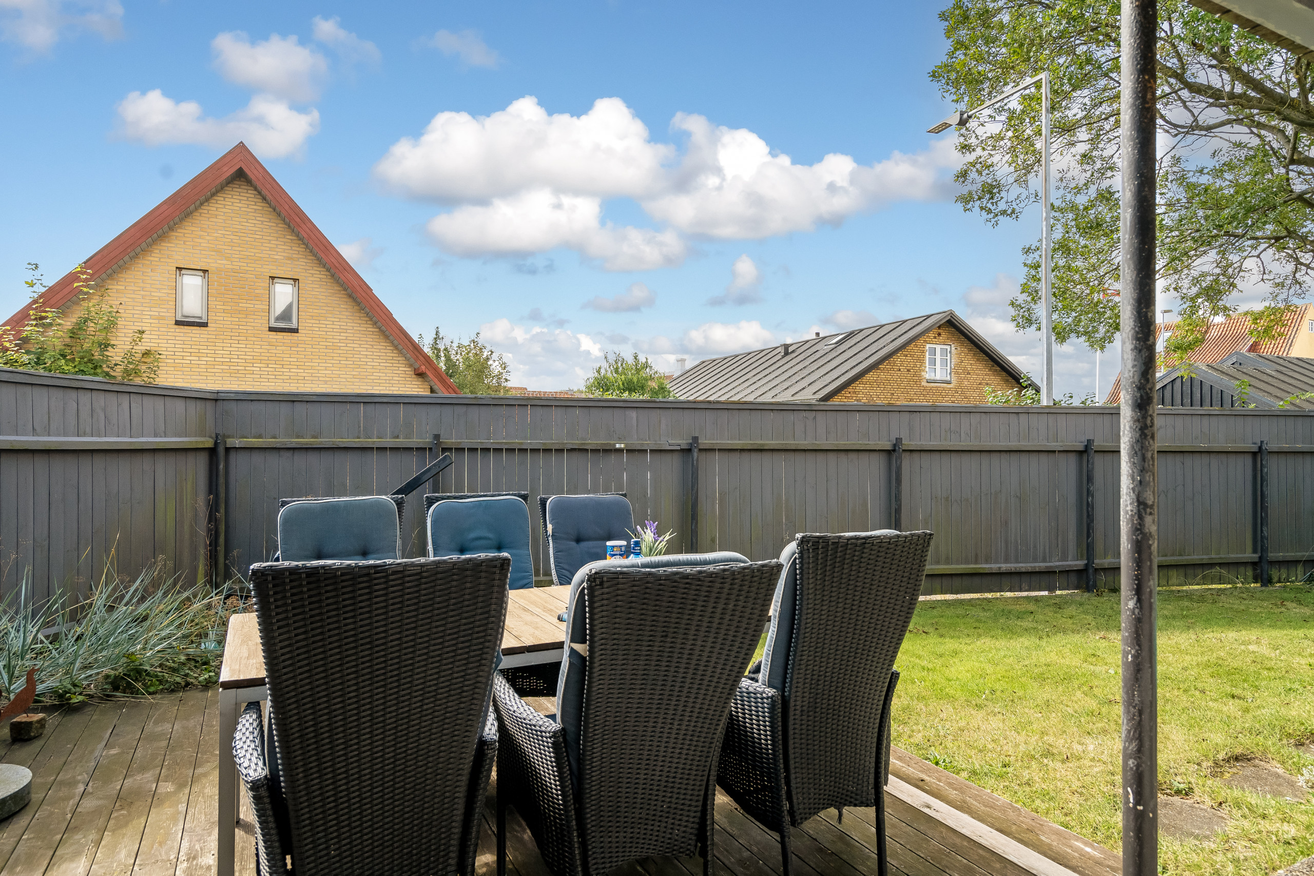 Ferieboligen er beliggende på en 200 m² stor naturtomt. Tomten er inngjerdet. Avstand til hav er 600 m. Nærmeste butikk ligger i en avstand på 300 m. Til ferieboligen hører åpent terrasseareal. I tillegg er det overdekket terrasse. Det er grill til rådighet. P-plass ved huset.