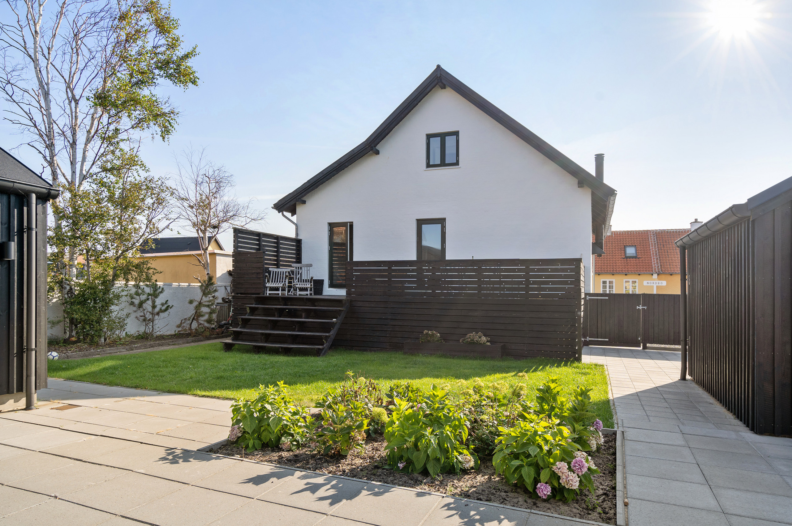 Ferieboligen er beliggende på en 504 m² stor anlagt have. Avstand til hav er 950 m. Nærmeste butikk ligger i en avstand på 50 m. Til ferieboligen hører 30 m² terrasseareal. P-plass ved huset.