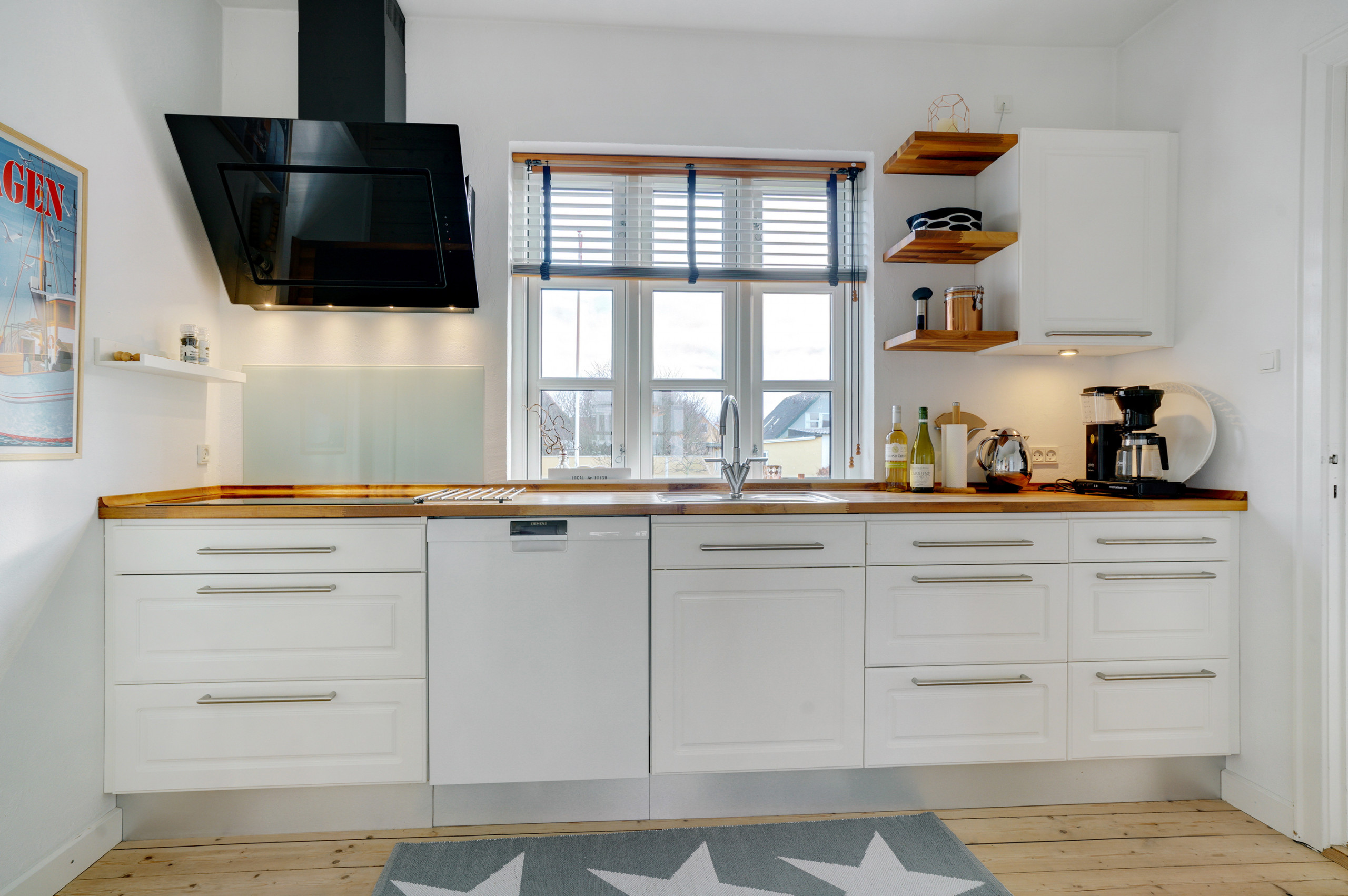 Kjøkkenet er utstyrt med 1 kjøleskap. Det er 4 induksjonskokeplater, varmluftsovn, mikrobølgeovn og oppvaskmaskin.
