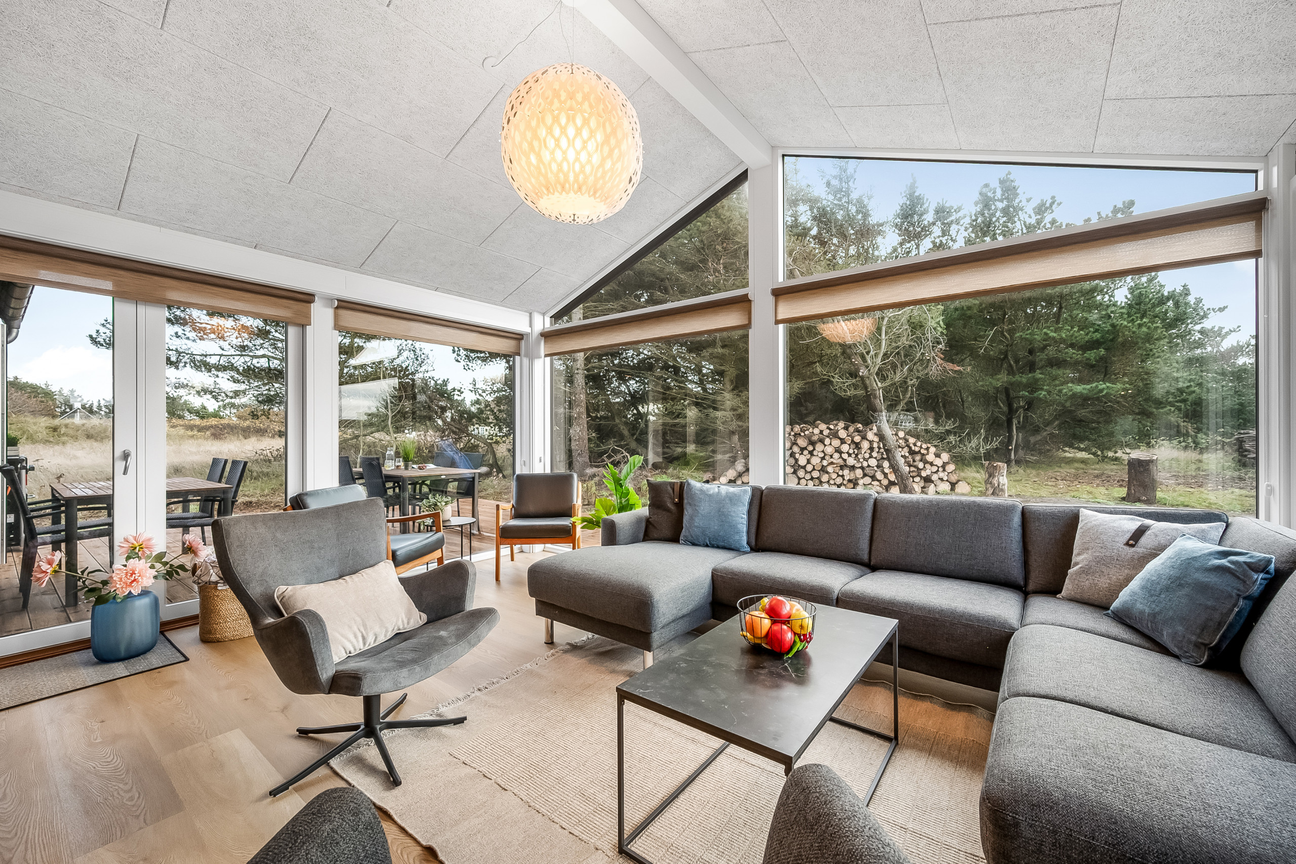 Ferieboligen er beliggende på en 2100 m² stor naturtomt. Avstand til hav er 625 m. Nærmeste butikk ligger i en avstand på 7500 m. Til ferieboligen hører åpent terrasseareal. I tillegg er det overdekket terrasse. Huske. Rutsjebane. Det er grill til rådighet. Det er montert kontakt til lading av elbil ved huset. P-plass ved huset.