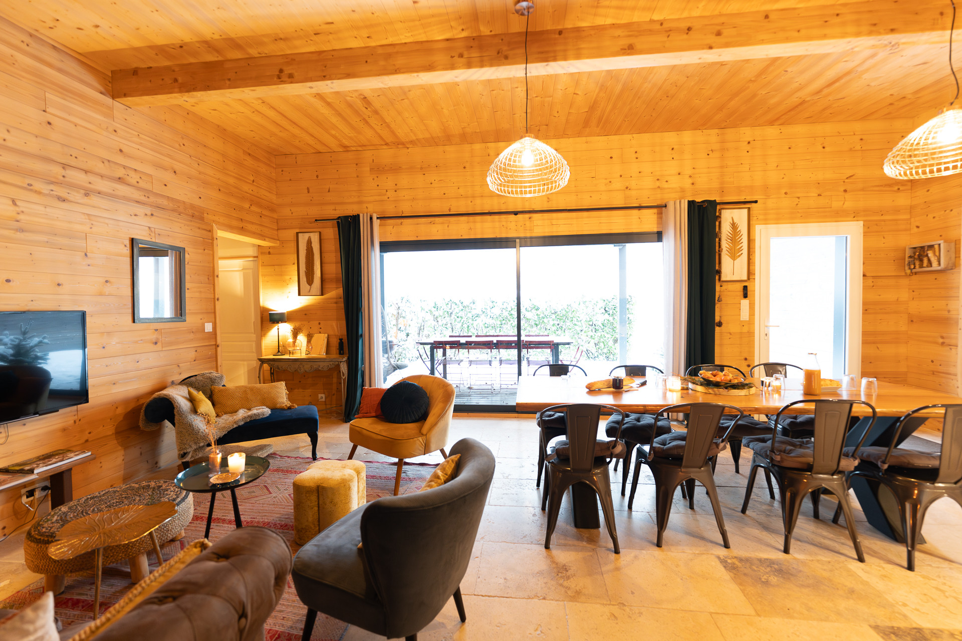 The dining room consists of a large oak table that can accommodate up to 14 people. In extension, the living room with its sofa and armchairs will brighten up your moments of relaxation.