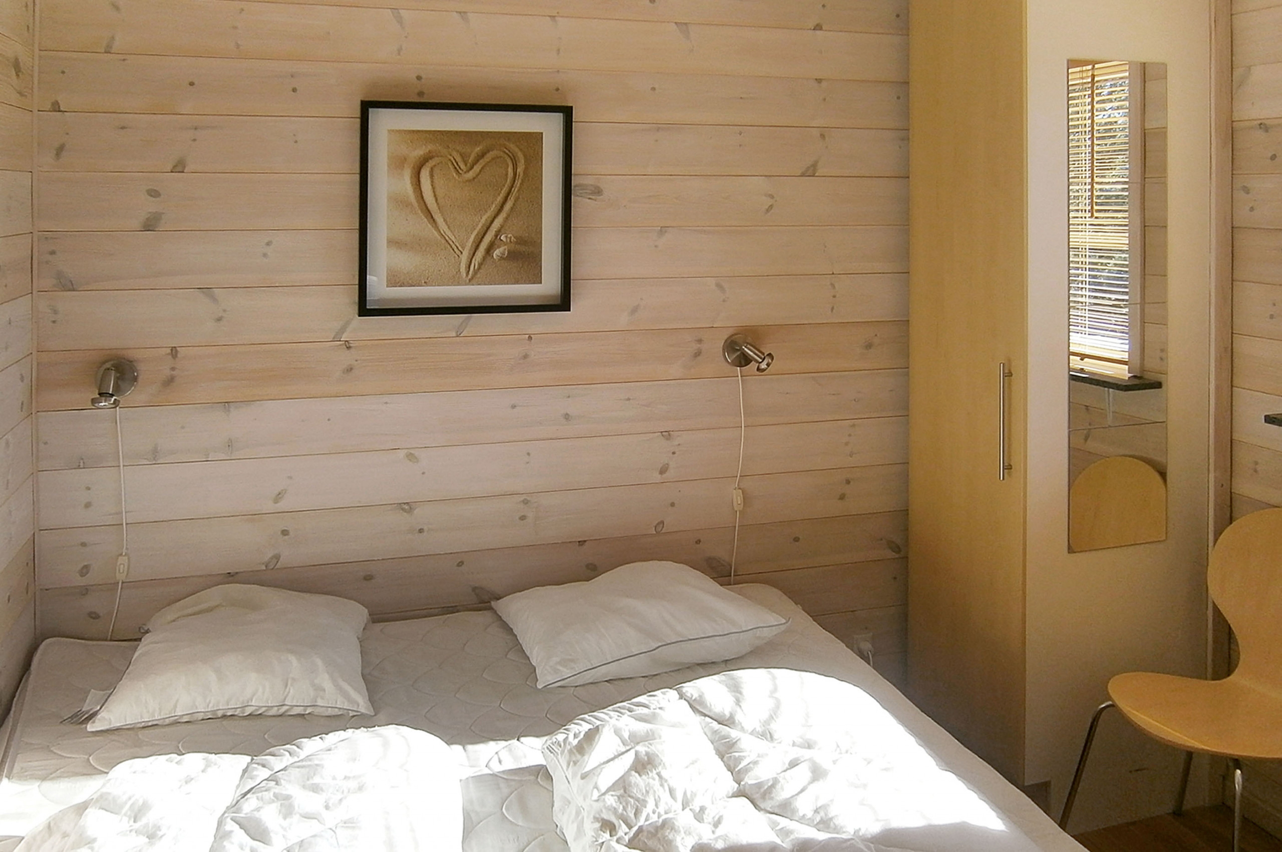 All together there are 3 bedrooms. The beds are divided on: 4 sleeping places in double beds. 2 sleeping places in bunk bed.- 2 of these sleeping accommmodations are located in the annex.