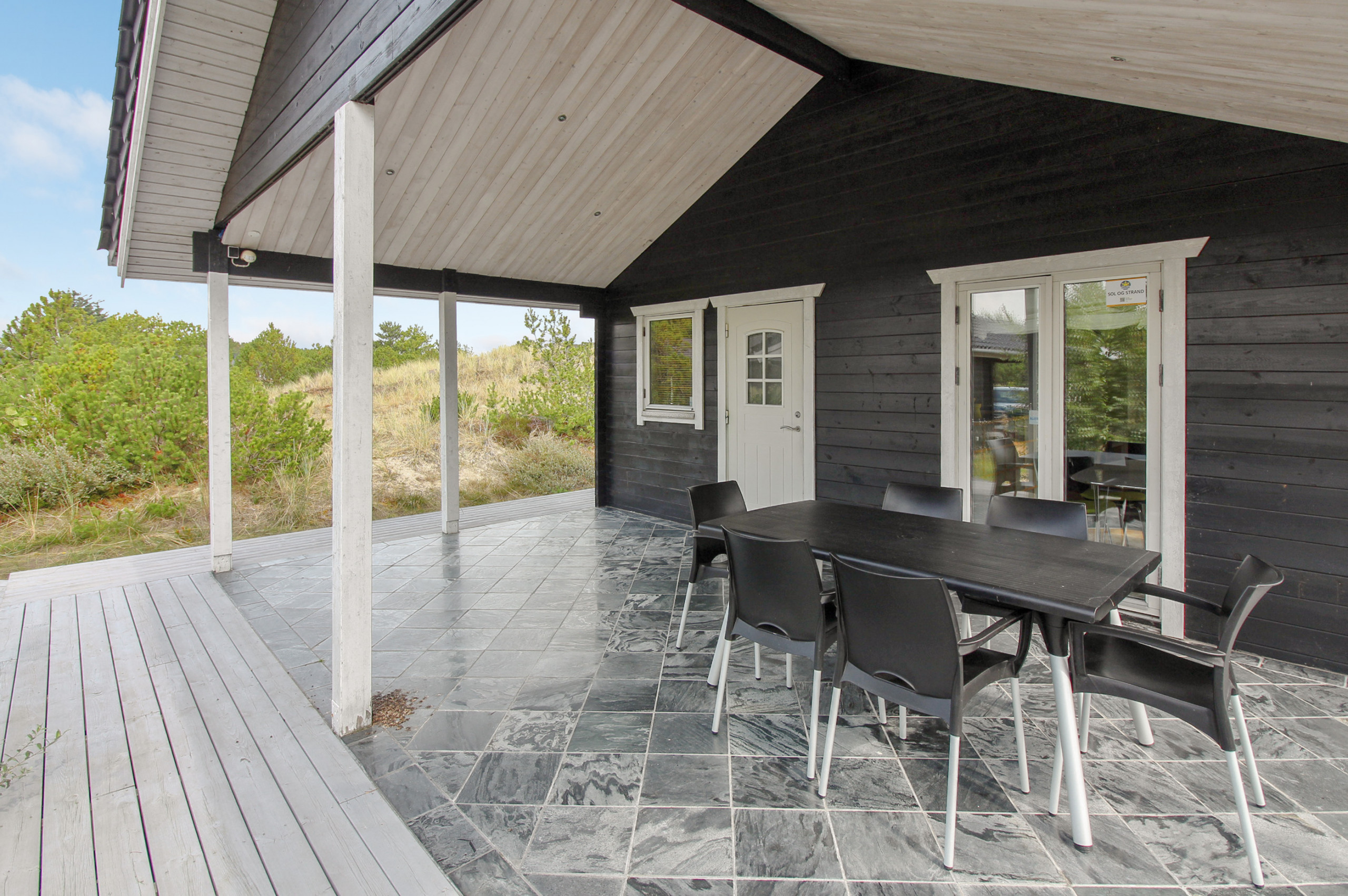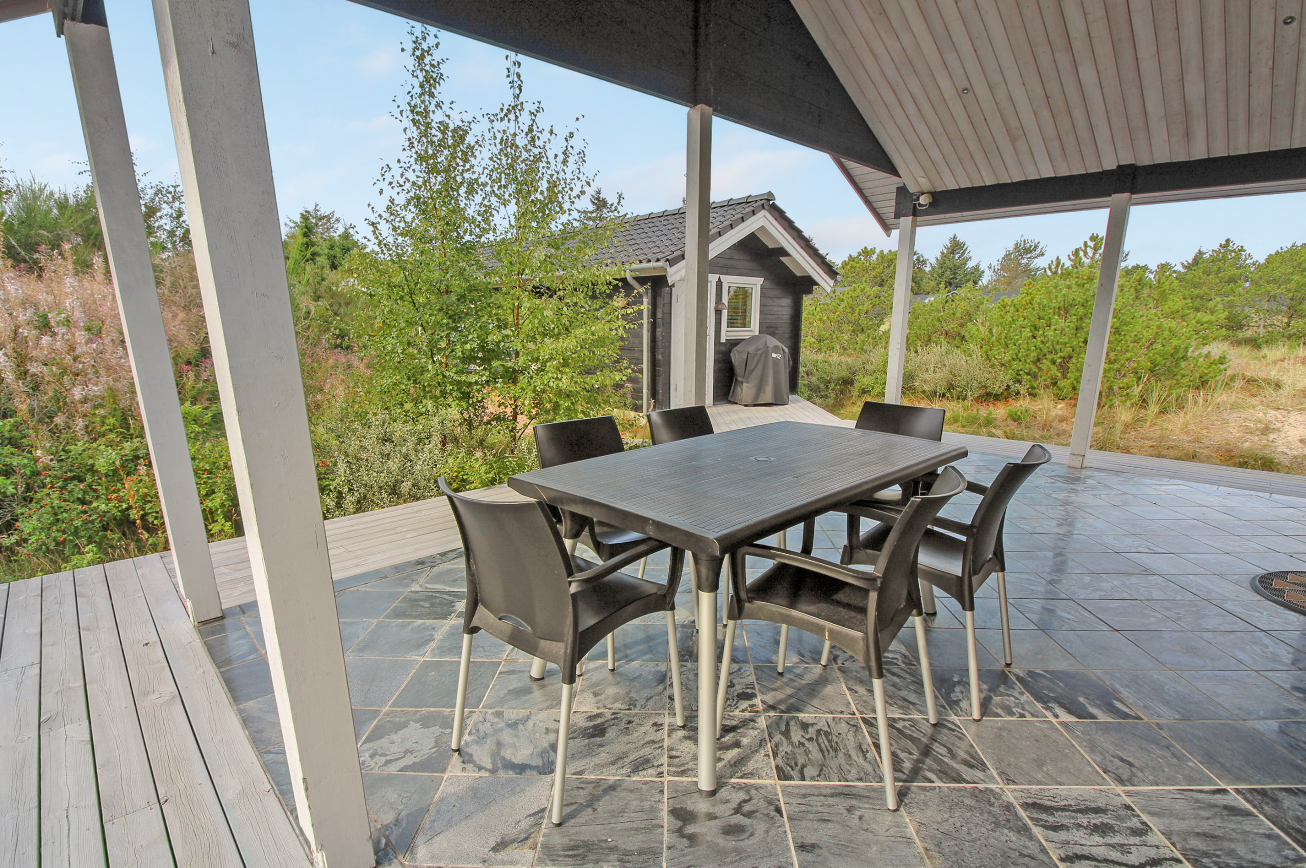The holiday home is situated on a 1689 m² dune site. Situated 150 m from the sea. Nearest shop is 2000 m away. A 100 m² terrace belong to the holiday home. Furthermore the house has a 18 m² covered terrace. Barbecue at your disposal. Carport is at your disposal. Parking place by the holiday home.